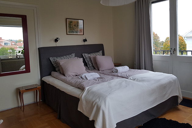 Apartment in villa on two floors with walking distance (about 1 km) to Elmia fair and about 5 minutes drive from Jönköping City. The apartment is a 4 room apartment and offers 3 double rooms with double bed (non divisible). One extrabed can be placed on request. Otherwise there is a large living with sofa and TV, a kitchen with dining table, bathroom with toilet and shower. An extra toilet is located upstairs. Parking and internet included.